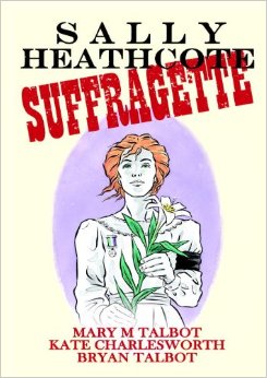 A talented trio created the fictional but history-based character of Sally Heathcote, through whose working-class eyes we see important, real-life events in British women’s struggle for the vote from the 1900s through the 1920s. This trio is Mary M. Talbot, Bryan Talbot, and Kate Charlesworth. Writer and professor Mary Talbot has collaborated once before with her acclaimed artist husband, Bryan Talbot. Their graphic novel Dotter of her Father’s Eye (2012), part biography of James Joyce’s daughter and part memoir, won the prestigious Costa Award for biography in 2012. For Sally Heathcote, Suffragette, Mary Talbot wrote the script, breaking it down into pages and panels, and Bryan Talbot did the page layouts, designed the panels, chose the colors, and drew the lettering. The busy Talbots trusted veteran illustrator Kate Charlesworth to draw the detailed images which hold our attention as we read this stirring book, filled with actions which sometimes broke the law—and laws that sometimes damaged protestors’ bodies and spirits. Charlesworth in an interview gives examples of how of how the trio worked together.
