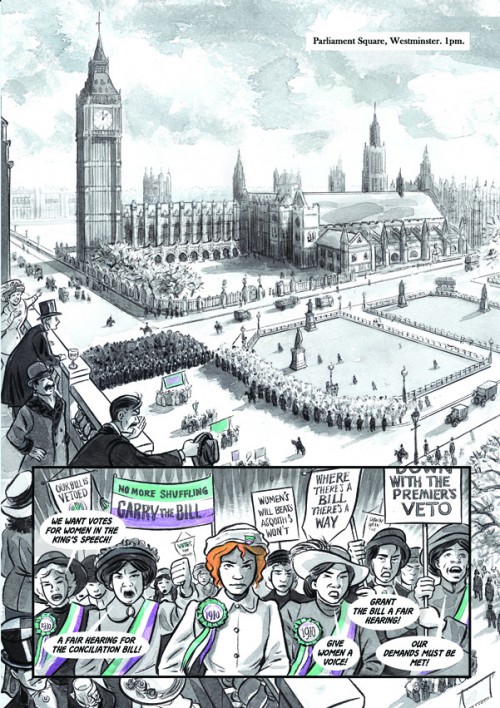 Mary Talbot’s script further engages our interest in Sally’s story by imagining how the suffrage movement affects her personal life. It costs her a close personal friend, another housemaid who fears losing her job if she associates with Sally, and it also temporarily halts a growing romantic relationship. Her sweetheart Arthur, who also works for women’s suffrage, remains with its “law-abiding” branch when Sally joins in law-breaking protests. How the two get together—and how World War I affects their lives—is movingly revealed in the novel’s framing story, set in a British nursing home in 1969. Elderly, ailing Sally–surrounded by mementos of her youth—is visited there by her daughter and granddaughter. Ironically, that 18 year old is not excited at the prospect of voting for the first time, not even sure she will “bother” with it. After this bittersweet conclusion to the novel, author Talbot includes a useful suffrage timeline, beginning in 1832 and ending in 1975. For those who wish to know more, she also includes page-by-page annotations and an extensive list of sources.