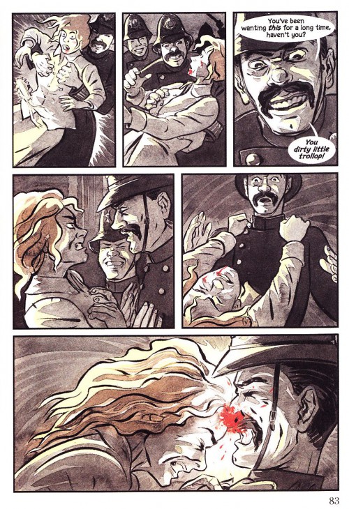 In Mary Talbot’s story, housemaid Sally Heathcote is befriended and employed by real-life luminaries in the British women’s suffrage movement: wife-and-husband Emmeline and Fred Pethick-Laurence, Emmaline Pankhurst, and her daughters Sylvia and Christabel. Sally herself becomes an activist, caught up in the violence that swirled around this movement and ultimately fractured it into two main branches—one willing to commit violent crimes to further the cause and the other not. Regardless of this division, women and men who campaigned for suffrage themselves often experienced violence at the hands of officials. One famous instance—police wading into a crowded of peaceful demonstrators and brutally beating and arresting them on “Black Friday,” November 18, 1910—is depicted here in a dramatic two-page spread. Its black-and-white panorama of violence, dotted with sprays of red blood, is balanced on one end by close-ups on the faces of nervous, determined police and of jeering opponents of suffrage and on the other by the dismayed faces of campaign staffers just learning about the violent arrests. The Talbots smartly show official sanction and public downplay of such police brutality by offsetting blocked newspaper quotations on these pages: “As a rule they [the police] kept their tempers very well, but their method of shoving back the raiders lacked nothing in vigor . . . . They [the police] were at any rate kept warm by the exercise.”