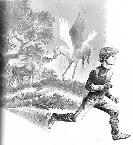 Yet, knowing that Ward (1905 – 1985) had also illustrated and written traditional picture books, I was pleased to discover his one wordless book for kids: The Silver Pony, A Story in Pictures (1973). Its grey-toned pages depicting a Midwestern farm boy’s adventures with a winged pony—whether imagined or fantastically true—will delight not only kids but anyone young at heart. Even though the small family farm Ward envisions is nowadays a vanishing reality, images such as a curious cow confronting that Pegasus are delightfully unforgettable. Ward’s depiction of the boy’s adventures is also an illuminating reminder of how imagination gives all of us wings.