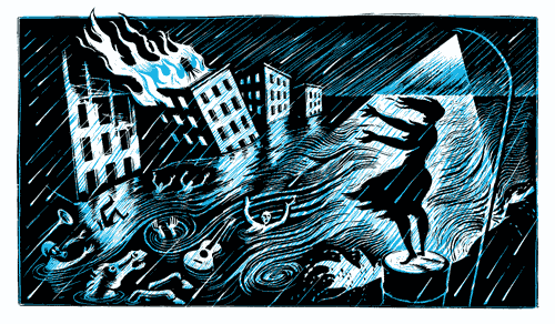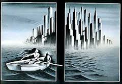 Erik Drooker’s Flood! A Novel in Pictures (1992; 2002) is stunningly good—an intense, semi-autobiographical look at the experience of an urban artist who loses his factory “day job.” He then wanders the bleak streets, subways, and boardwalks of New York City, seeking relief first in sex, then in amusement park side shows and rides before returning to his drawing board. Limited use of color is important in this mainly black-and-white book; it is only in its second half that Drooker adds bright blue to his expressionist images, emphasizing the phantasmagoric nature of his narrator’s experiences. The artist sees an Inuit tale he is illustrating come to life, seems to float above Coney Island’s roller coaster, and “sees” images of the United States’ grasping, harsh treatment of Native Americans, Blacks, and urban protestors. Like the flood that engulfed Biblical Noah’s degraded world, a rising tide covers iconic New York City skyscrapers, but only the artist’s cat—adrift with the shivering artist in a rowboat—finds shelter on a new, post-apocalyptic ark.