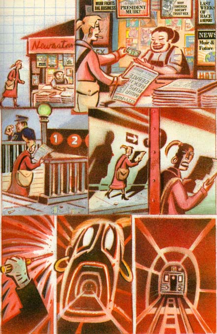 Kuper created the book’s color-saturated pages by the unusual, labor-intensive means of stencil cutting and then spray-painting his images. Their colors sometimes bleed into one another, a visual effect he chose to support his storytelling goal: to see how the lives “of a subway car full of commuters . . . crisscross and impact one another in positive or even catastrophic ways . . . .” It is a great goal, as we wonder and watch in suspense to see how the different story arcs overlap and finally come together. Kuper’s characters are the working poor (including a mother supporting her child by working as a stripper), minor drug dealers, police officers “on the take” as well as overworked detectives, victims of a racist attack, and the homeless. The one suburban, seemingly middle-class character is a man catching the subway at Grand Central Station, travelling in to regularly visit his hospitalized, AIDS-stricken lover. Financial and social success are dubious achievements in this slice-of-life book. The only richly-dressed character is a smuggler of explosives, while images of newspaper and TV news headlines spotlight corrupt officials. In Kuper’s world-view, our current systems—of government, business, and even health care—are failing large numbers of people.