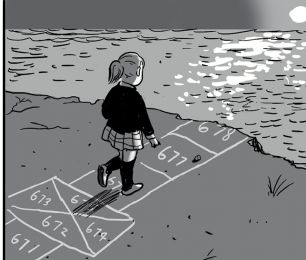 Like many almost-graduates, the seniors of Supermutant Magic Academy are filled with more questions than answers about the future. The wordless nighttime episode in which a minor character is playing hopscotch, only to discover before the last leap that her playground is being flooded, captures this uncertainty. Tamaki effectively draws this episode from different angles, using close-ups as well as mid and long-distance shots, which let us experience this ironic surprise along with the character. Like the tide, life for these teens is surging ahead and washing away familiar routines. Similarly, given what we have seen of dead-pan, intense Marsha, her surprised remarks during a school assembly—“WHAT? We GRADUATE? . . . . I guess I just figured we’d be stuck in here forever . . . .” –may be viewed as emotional truth as well as ironic commentary on school life.