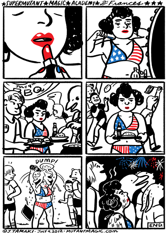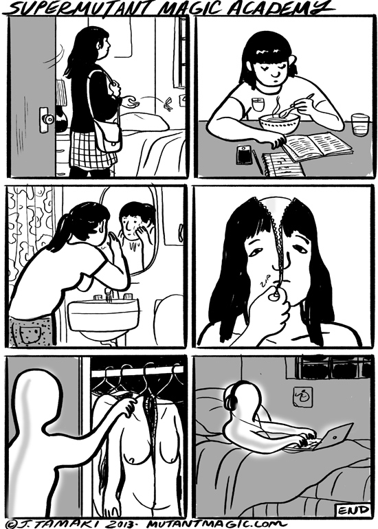Its web comic origin—with episodes usually limited to lengths of one to six frames—means that most of SuperMutant Magic Academy is told as a series of mini-stories, linked by setting and characters rather than an overarching storyline. Yet the focus on a limited number of characters, along with the restrained, telling use of color in its black-and-white drawings, reduces the “choppiness” of the narrative. (One colorful instance is a teenager’s failing attempt to comment sarcastically about how U.S. 4th of July celebrations have wandered across Canada’s border.) By the time we reach the new material Tamaki created to conclude the book—a forty-page long account of how these characters weather prom and graduation, we feel well-acquainted with them. The one page epilogue—summing up each central character’s life after high school under thumbnail-sized, year book like “headshots”—is a welcome, satisfying riff on school traditions.