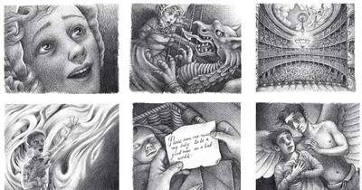 Unlike Hugo Cabret and Wonderstruck, works which intertwine their visual storytelling throughout each volume, The Marvels only employs wordless storytelling to begin and end the book. But what a remarkable, engrossing beginning and ending these are! We are caught up in the sweep of their mysteries, told in double-page spreads drawn in Selznick’s characteristic style: cross-hatched, deeply-shaded black-and-white penciled images that capture people and events in realistic detail. This realism makes each twist and turn of events an even bigger, more emotional surprise—emotions further enhanced by Selnick’s cinematic use of close-ups and shifts in perspective. These techniques very effectively spotlight dramatic moments and convey shifts in time and place.