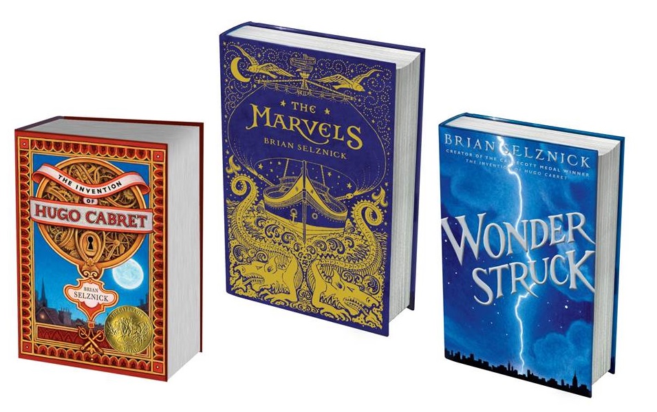 I am smiling as I sit down today to share thoughts inspired by The Marvels (2015), the newest beautiful book by award-winning author/illustrator Brian Selznick. The Marvels continues the hybrid format—interspersing pages of prose with pages of wordless visual narrative—that Selznick pioneered in The Adventures of Hugo Cabret (2007) and Wonderstruck (2011). In Selznick’s three books, tracing the stories told through pictures and then piecing together their meaning in relation to the prose make the very process of reading (or rereading) its own mysterious, very satisfying adventure. I certainly looked forward to and enjoyed rereading Hugo and Wonderstruck before sitting down to blog today!