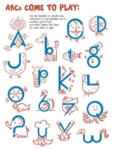 Yet Comics: Easy as ABC! is not just for young artists already comfortable and confident in their abilities.  Beginning with “Doodles” and “Basic Shapes,” Brunetti assures readers that “There is no one right way to draw—the fun is finding your own way of drawing.”  Fun is a key element in this book.  Its illustrations are playful, and its comments wryly funny.  Bits of advice come not just from Brunetti but from a host of other successful comics creators: these include Roz Chast, Neil Gaiman, Kevin McClosky, Jeff Smith, James Sturm, and Chris Ware.   Sometimes they good-naturedly poke fun at themselves and each other.  I particularly enjoyed Chris Ware’s “Pro-tip #66: Get a PILLOW!” with its illustration showing a big-headed Ivan Brunetti at his drawing board, sitting on a tiny pillow!  Some elementary-age readers will get the joke here, while the youngest users of Guide may casually skip over it, focused more on Brunetti’s brisk directions and many opportunities for step-by-step drawing practice.